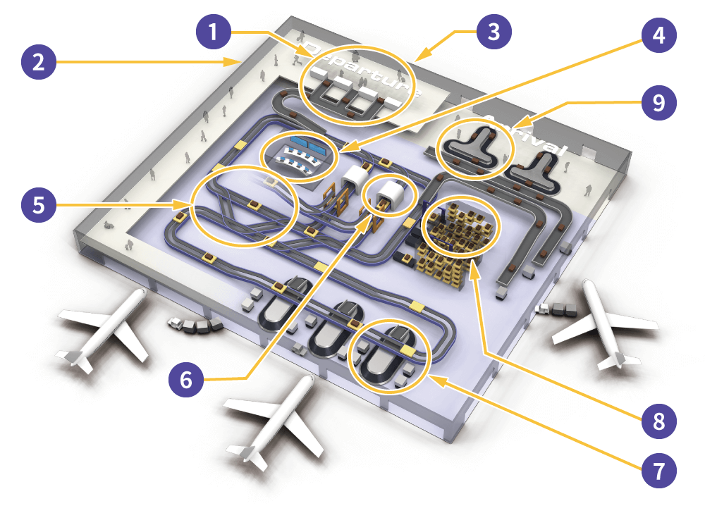 提供最优系统满足每个机场的规模和需求,包括带式传送机、斜托盘整理机和高速精密包托系统