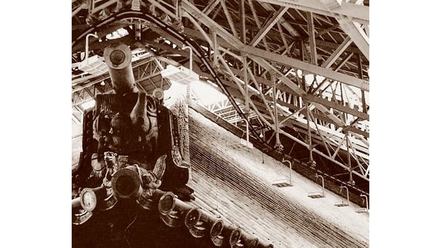 1973年に始まった東大寺大仏殿の昭和大修理で、瓦の搬送に当社のトロリーコンベヤが採用されました。工期中、無事故・無災害の上、省力化に貢献しました。