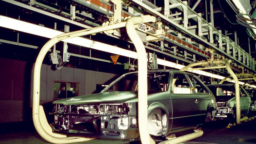 1983年、ラムランの1号機がトヨタ自動車元町工場で稼働開始。急速に普及する産業用ロボットにも対応した"FA時代の新しい搬送システム"として注目を集めました。