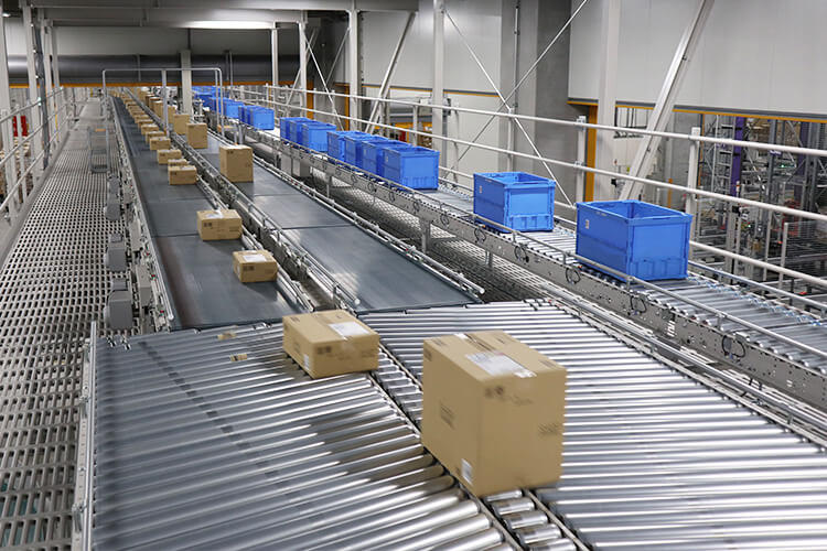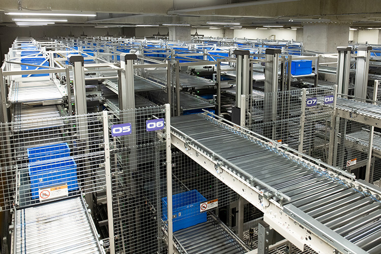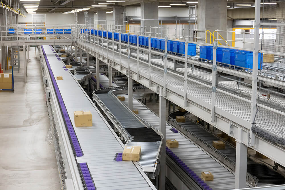 単行スピードラインや梱包レーンで箱詰めされた商品は合流した後、サーフィンソータで方面別に仕分けされる。
