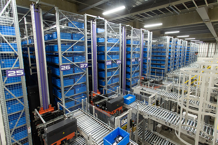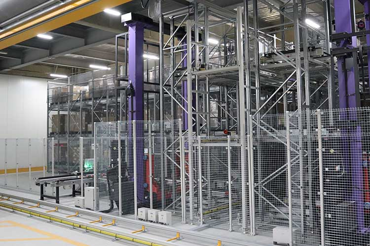 商品在庫を保管するケース自動倉庫(左)と、ピッキングが完了していないコンテナを一時保管するシャトルラックM(右)。