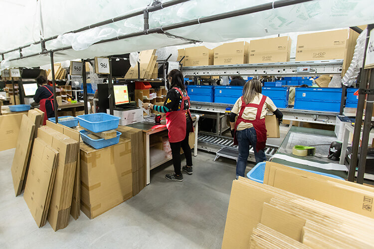製函機(左)で組み立てられた段ボール箱に、梱包レーン(中央)にいる作業スタッフは緩衝材などで商品を保護し箱詰めを行う。コンベヤに投入後、封函機(右)を経て、出荷ラベルが自動貼付される。