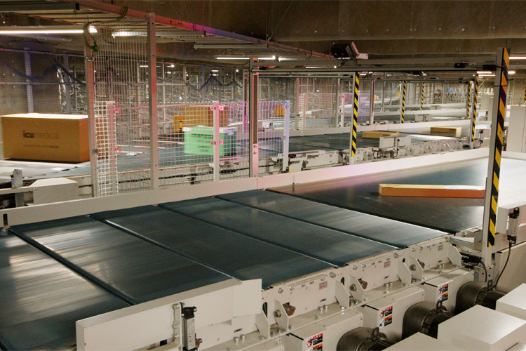 クロスベルト方式は台車を個別に管理する仕組みで、これによって処理能力が向上したほか、万が一、台車が故障した場合も、その台車に荷物を載せないように設定すればよいので、ライン全体を止めることはありません。物の流れを全て止めなくてよいというのは、大きなポイントです。