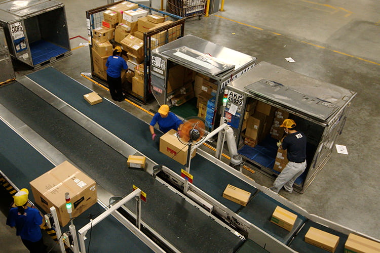 クロスベルトソーターでは台車に荷物の情報が紐づいており、台車が行き先のシュートに差し掛かると、台車のベルトが駆動して荷物をシュートに払い出します。シュートの先端では、スタッフが手作業で航空貨物用のコンテナや、かご車への積み付け作業を行い、トラックに積み込んで出荷します。