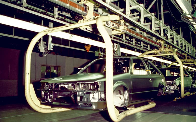 産業用ロボットの需要がさまざまな業界で高まっていた1980年代初頭。自動車業界でも生産台数の増加に伴い、ロボットを取り入れた生産ラインのさらなる自動化が急務になっていました。一方で、それまで主流だったチェンコンベヤによる搬送ではロボットの機敏な動きに対応しきれず、十分な生産効果が得られなかったことから、新しい搬送システムを求める声が出てきました。