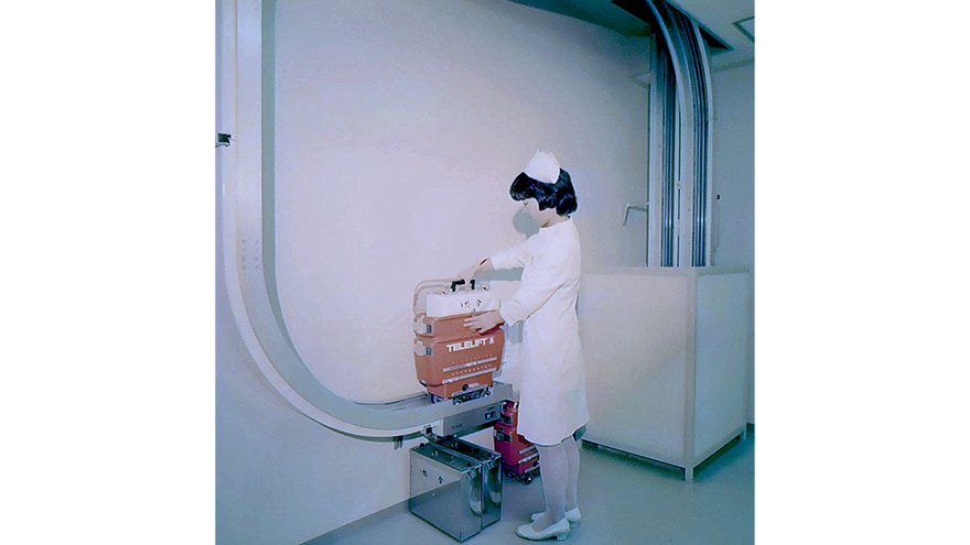 1975年、天井空間を走行して書類などを搬送する「テレリフト」の国内1号機を大宮赤十字病院に納入。以来、図書館や企業でも活用されるなど、事務系業務の省力化に貢献しました。