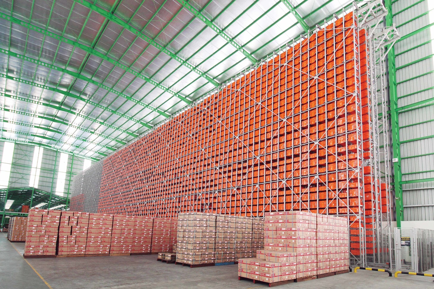 新倉庫は、大量オーダー用の商品を保管するエリアと小量オーダー用の商品を保管する自動倉庫エリアで構成されています。