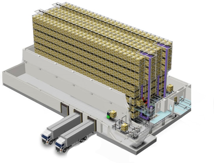 生産加工ラインから自動倉庫へ、自動倉庫からピッキングステーションや出荷コンベヤへと荷物を運び仕分けます。