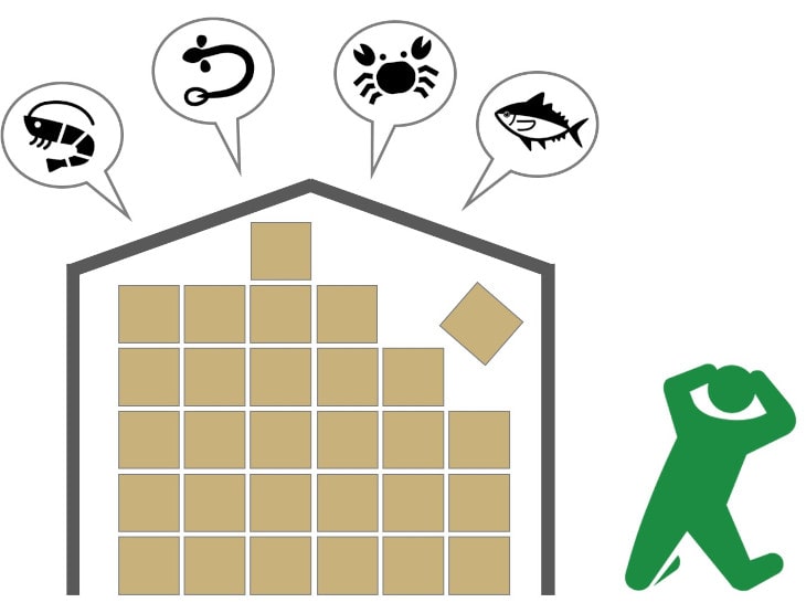 BtoC市場におけるeコマースの普及、ふるさと納税の利用者増加により、水産加工業界でも多品種少量出荷への対応が求められています。扱う商品量や品種数の増加に伴うスペース不足を、外部の営業冷凍倉庫の利用などで対応する結果、保管コストの上昇や在庫管理の難しさが課題となっています。