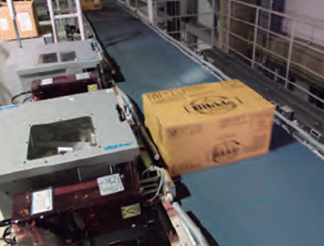 5级ピッキング後の商品に、自動ラベラーで出荷ラベルを貼り付け。