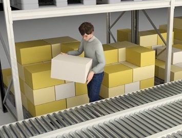 二叉A品は自動倉庫からピッキングステーションに出庫し、ケースピッキングした後、コンベヤに投入。Dualタイプの採用により、高頻度の入出庫に対応。