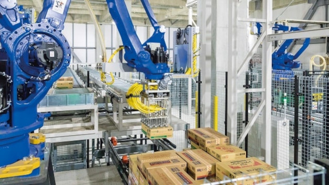 複数の生産ラインからランダムに流れてくる製品を、シャトルラックMに入庫。1パレット分の荷物が揃ったら、グループ単位でパレタイジングロボットに供給し、単一SKUパレットを作ります。