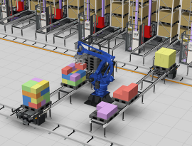 在庫パレットに段積みされた商品をロボットが自動ピッキングし、オーダー単位の混載パレットを作ります。パレットへの積み付け順指定がある場合は、自動倉庫から順列出庫を行います。シミュレータによる最適積み付けパターン算出により、安定した出荷荷姿を作ることが可能です。