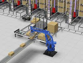 仕向先別に仕分けられた段ボール箱を、ロボットがカゴ車へ自動で積みつけします。シミュレータが最適な積付けパターンを自動計算し、完全自動で処理します。