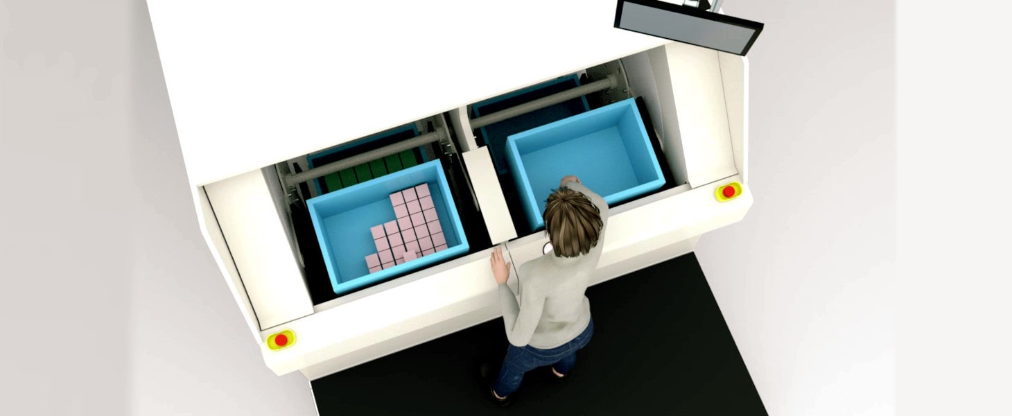 在庫コンテナと集品コンテナの両方が作業者の手元に自動供給されます。表示器の指示に従い、必要な数量をピッキングします。ピッキング元とピッキング先が1つずつ供給されるため、間違った集品コンテナに投入することがありません。