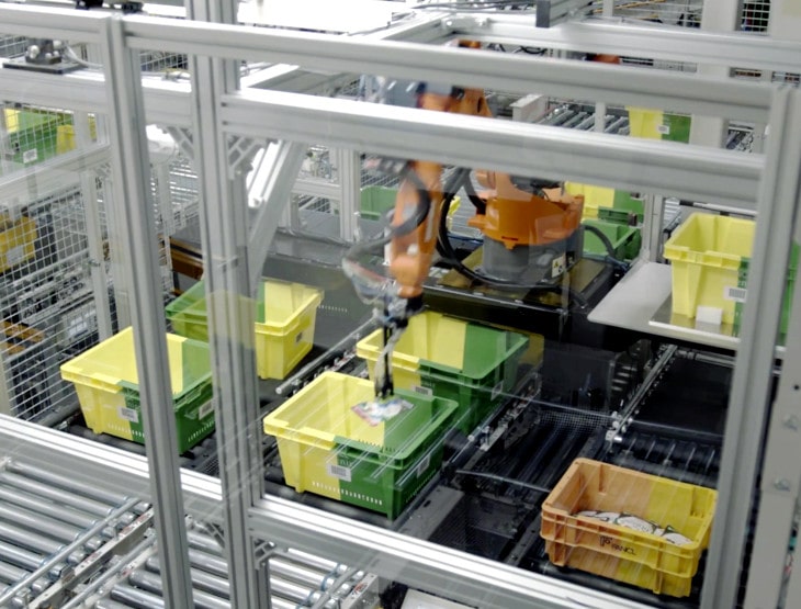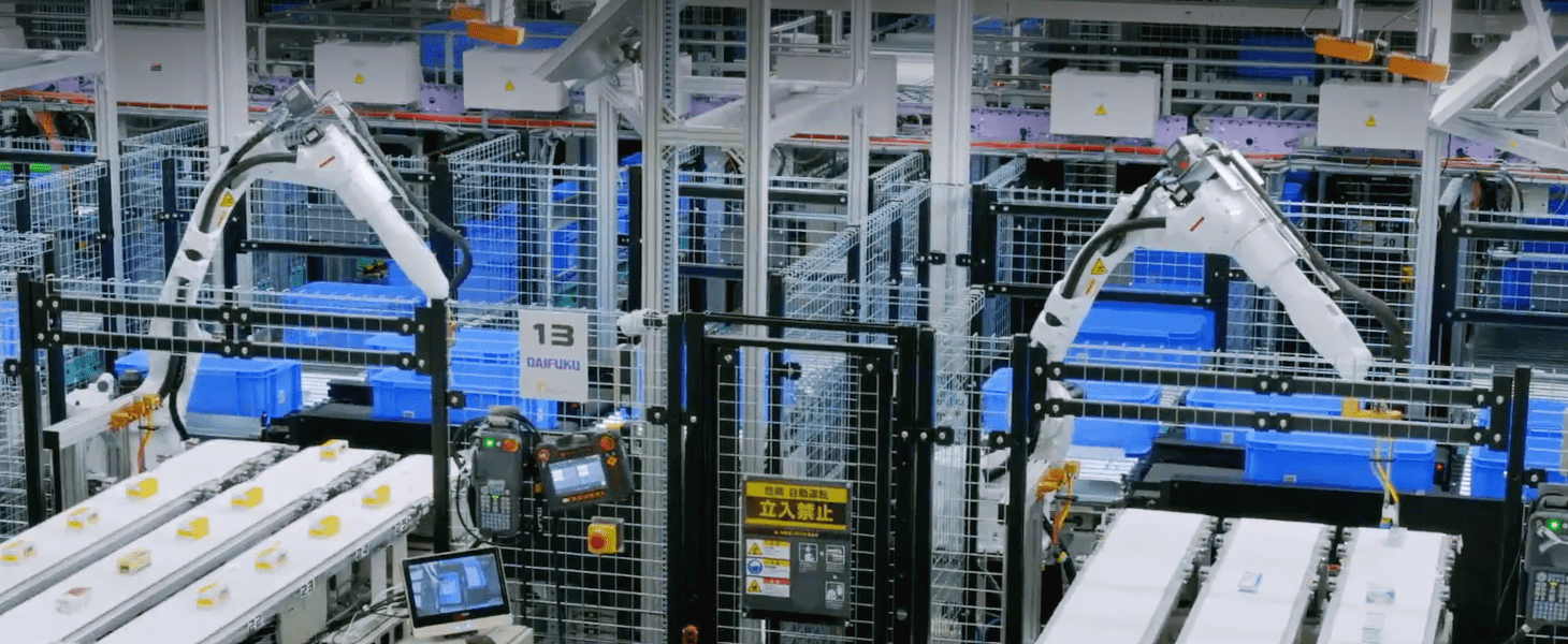 自動倉庫から出庫した在庫コンテナから商品をピッキングし、ピースコンベヤへ供給。複数ロボットステーションから流れてきた商品を、コンベヤ側でオーダー別に集約し出荷へ。