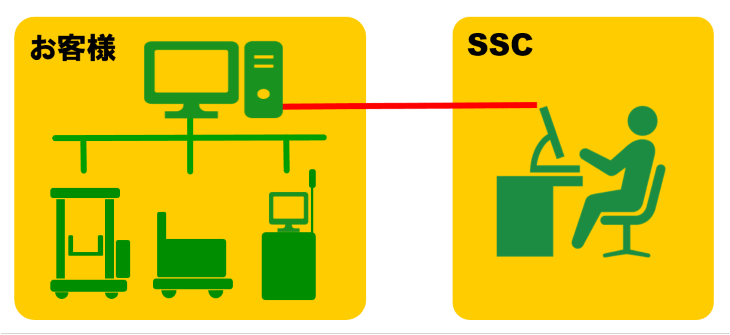 障害発生時に、電話回線を利用してお客様設備とシステムサポートセンター(SSC)を結び、遠隔操作によってメンテナンスするサービスです。SSCの技術者が直接システムの状態を確認、原因調査、障害の復旧を行いますので、復旧時間の短縮が期待できます。