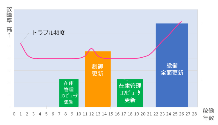 代表例として自動倉庫は大きく分けて、在庫管理コンピュータ(WMS)、制御、機械の3要素で構成されます。3要素を同時期に全面更新することが理想的ではありますが、費用が大きく、停止期間も長くなることから、常に最良の方式とは言えません。コンピュータ、制御、機械それぞれの保守期間が異なることから、各々最適なタイミングでリニューアルして行くことも可能です。
