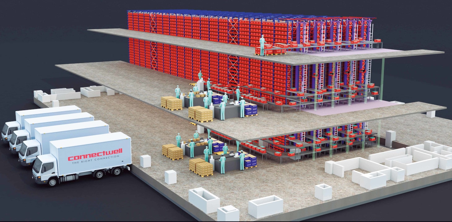 产品和半成品存放在固定架子上,Connectwell依赖人工管理货物随业务量增加,存储和运输容量达到极限连通决定审查仓库运维,引进物料处理系统并实现自动化运维,以克服后勤问题并实现进一步扩大销售