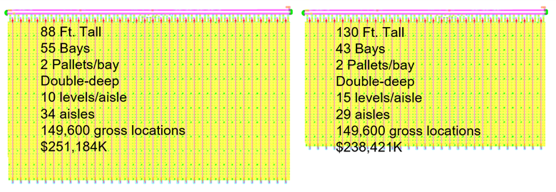 最近我还参与分析数个AS/RS构建选项建筑AS/RS高88尺(26.82米)(低价起重机)比建130尺(39.62米)高130英尺楼(39.62米)不变物价12.7M略低建成本,尽管高成本起重机技术提高