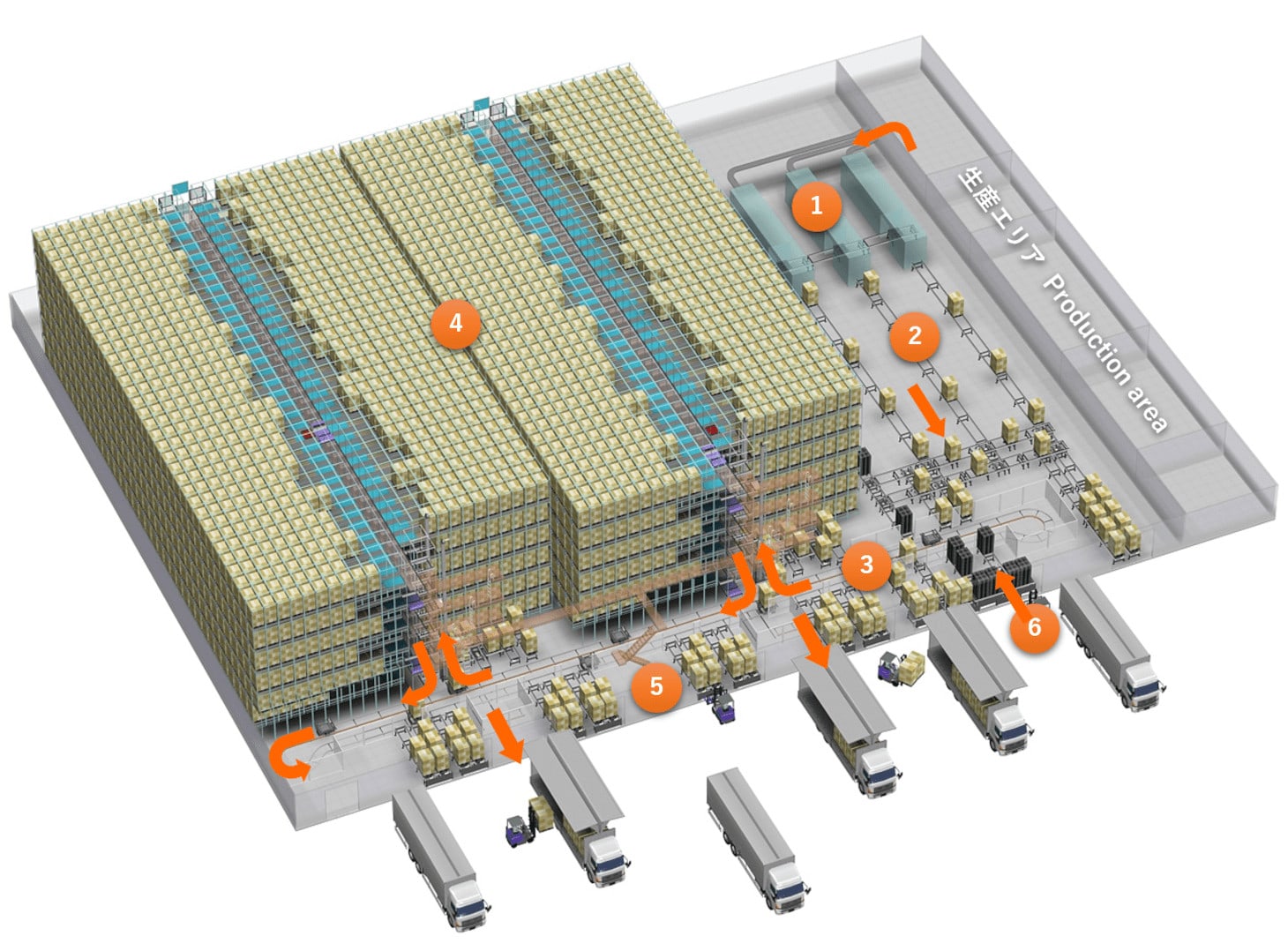 在上述模型系统内,从生产线运输的饮料产品案例由层托盘堆叠(1)并输入D3(4) 通过托盘传送器(2)和高速铁路引导车STV.(3)批量发货由D发送3通过STV转卡车BERTH端传送器5堆积空托盘返回网站后从卡车BERTH端传送器(6)通过STV传输层托盘结合其他物料处理设备D3提供从生产到运输的高层次自动化