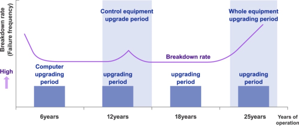 | ~12年 | 控制器 | 控制设备使用的电子组件几年后停止使用,以跟上技术革新,使其难以修复或替换一般来说,最长使用期根据设备折旧期确定为12年金博宝捕鱼DaiFuku内部制造的控制模块,我们认为可用周期为12年,其中包括7年服务期和5年修复期 |