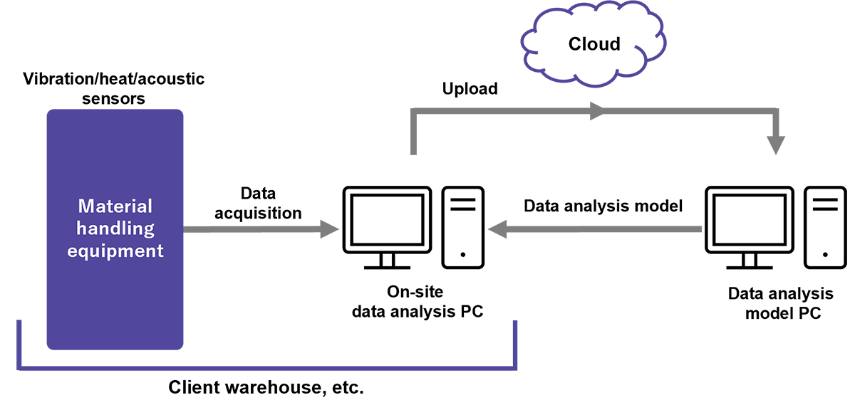 内部后勤业务中,小组建立了一个独特的预测维护系统,自动化视觉、人工和监听检查预测维护系统用我们专有传感器测量振动、热生成和声学,用PC分析边端设备现场收集的数据并通知客户设备异常点和预测故障点系统还自动向云上传数据,分析故障数据并用AI构建设备诊断异常检测模型系统消除传送系统故障并保持设备畅通运行
